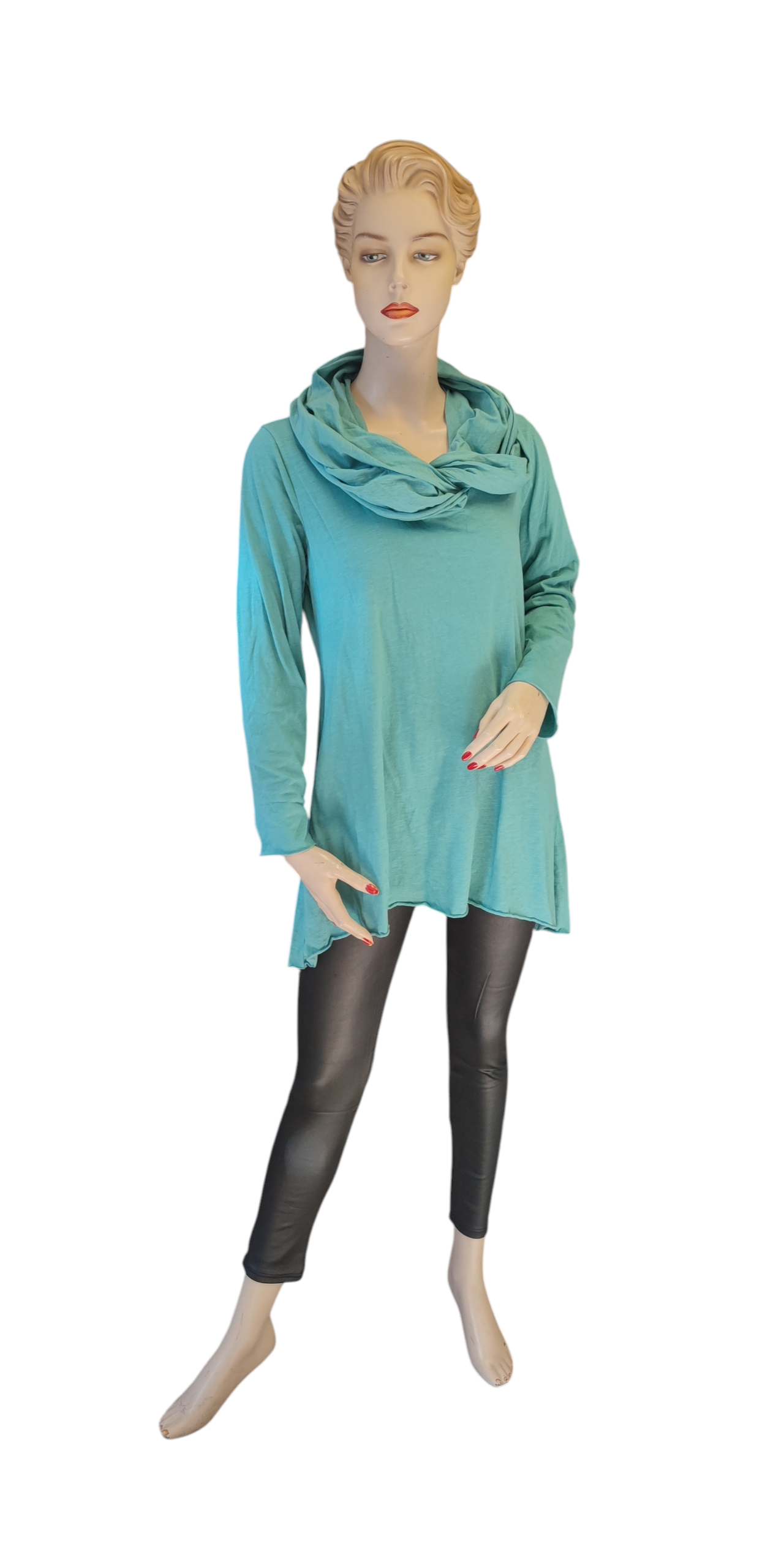 Kékes zöld színű kámzsa nyakú A-vonalú hosszított fazonú felső.