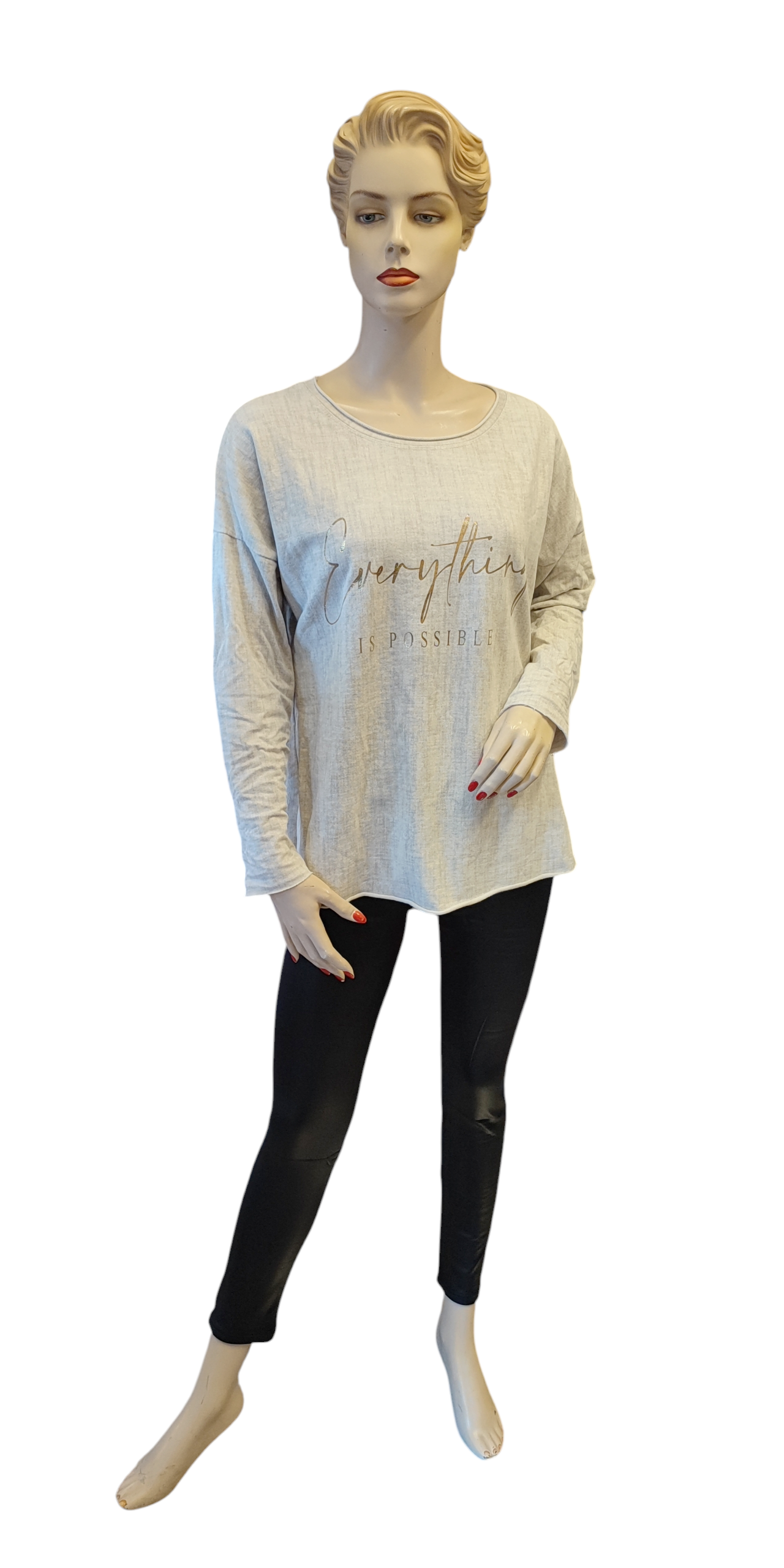 Finom pamut felső „Everything is possible” arany felirattal. Színe drapp és enyhén szürke melíros.
