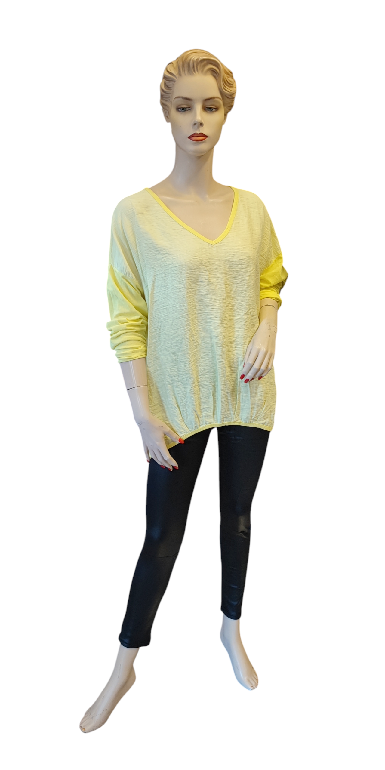 V-nyakú, hosszú ujjú felső, elöl alul húzott. Eleje viszkóz, újja és háta pamut. Színe sárga.