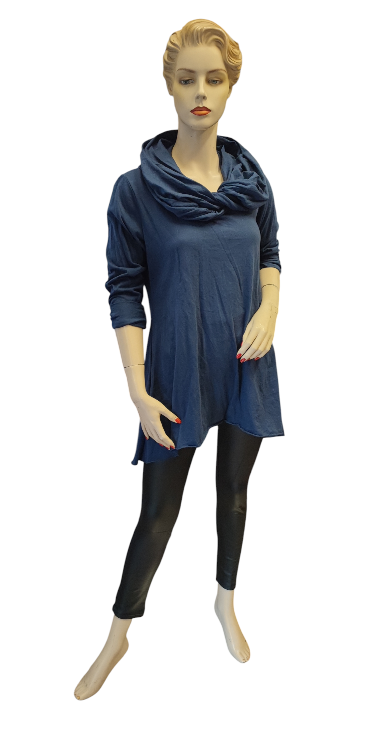 Sötétkék színű kámzsa nyakú A-vonalú hosszított fazonú felső.
