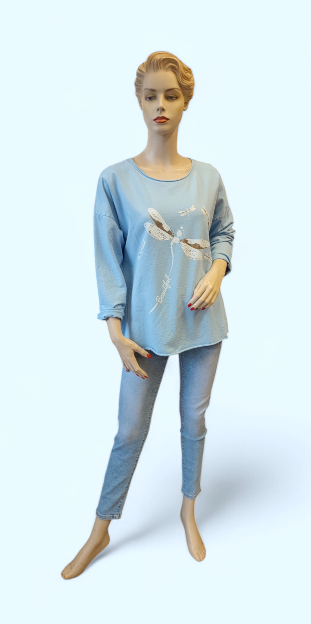 Világoskék színű szitakötő mintás felső „Beautiful” felirattal.