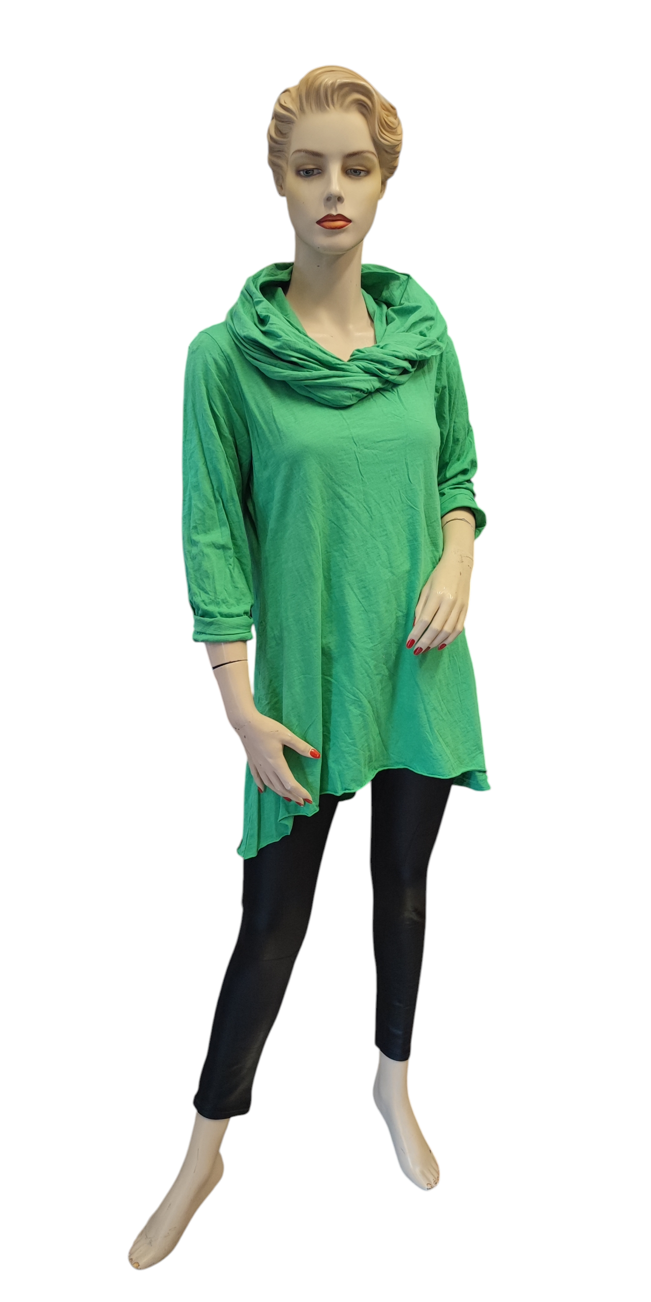 Zöld színű kámzsa nyakú A-vonalú hosszított fazonú felső.